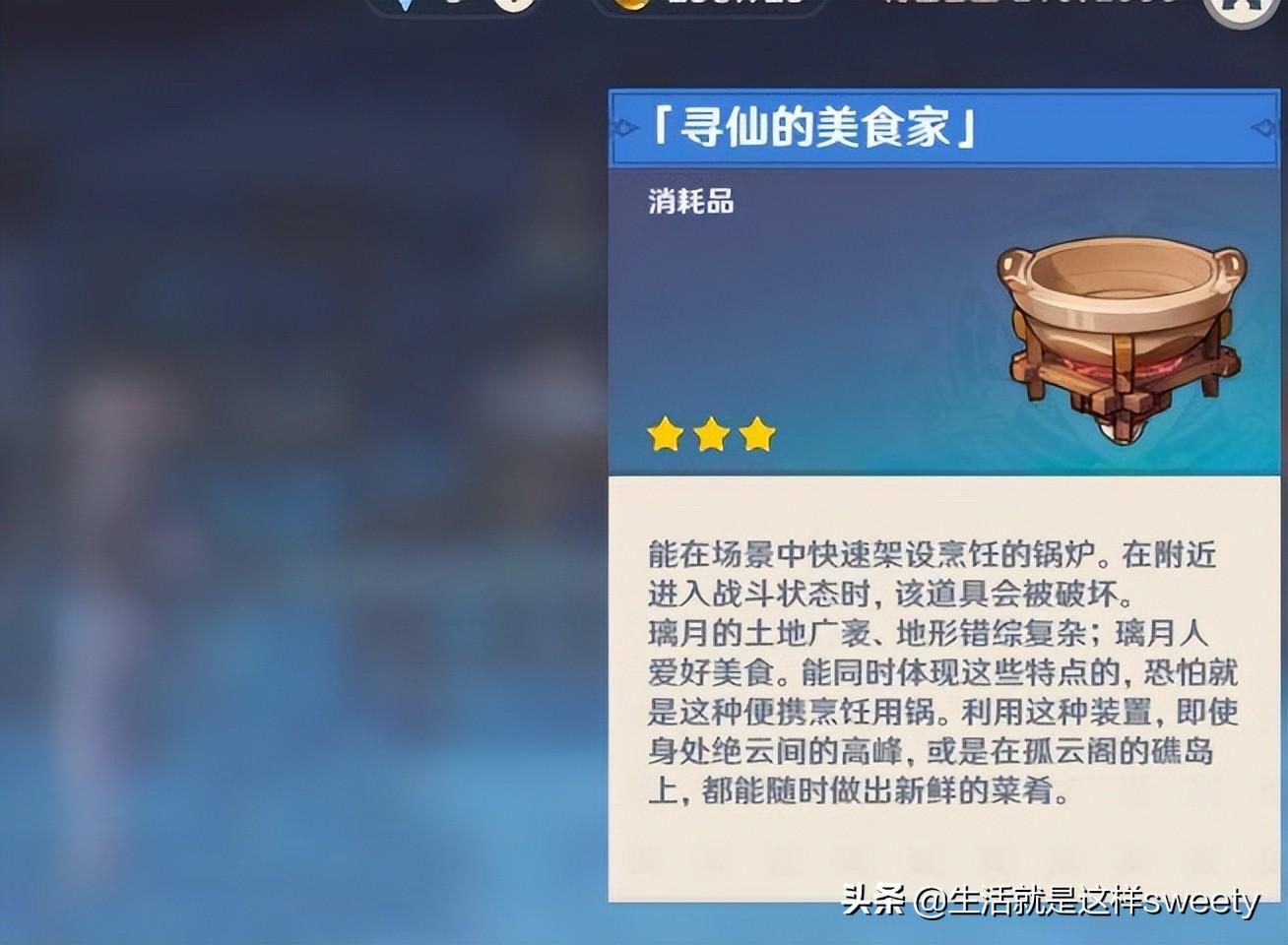 制作「寻仙的美食家」需消耗烈焰精油*1、晶核*2、铁块*2,在非战斗场景中快速搭起锅炉可以制作食物,如果附近进入战斗状态,该道具会被破坏