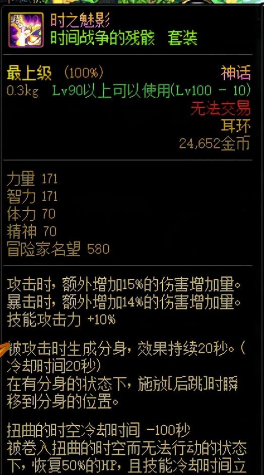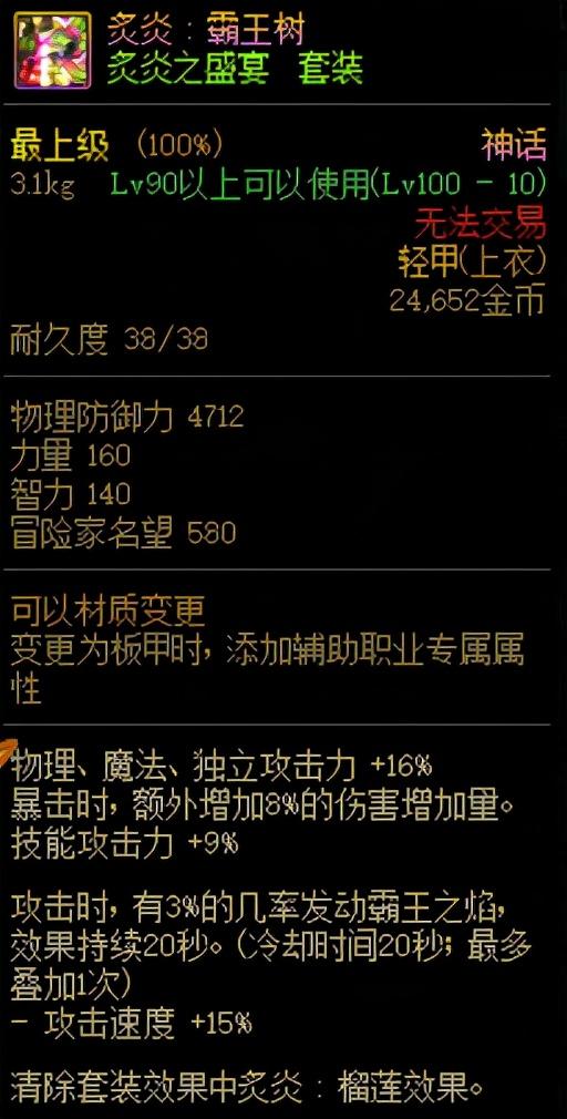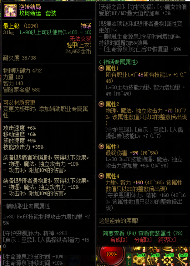说到逆转结局神话,在之前的神话改版中成为了版本的宠儿,原有的30~48技能+1变为了1~48技能+1,使原本就不弱的它伤害更上一层楼,强大的35%技能攻击力词条搭配技攻玉伤害更上一层楼,恐怖的双绝伤害使它在奥兹玛副本也能横着走,不过缺点是仅限于爆发职业使用(红眼、剑魔等等)。