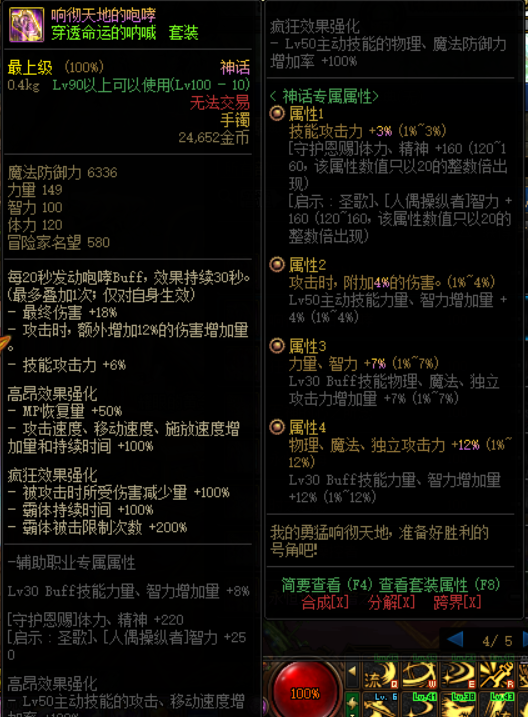 此件神话不仅可以作为输出职业的毕业,在辅助职业身上同样适用,神话属性提供10%的三攻加成,配合遴选出白字的属性,成为一个爆发极强的三攻奶也未尝不可。