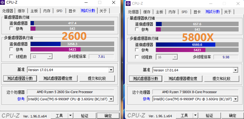 结合LOL实测,AMD 2600和5800X这两款CPU-Z的跑分情况。