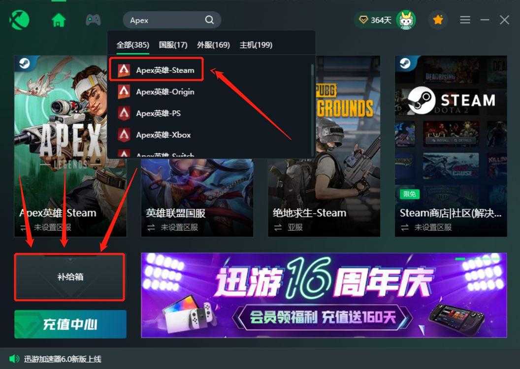 1.打开迅游加速 器,在迅游搜索Apex后选择Apex英雄-Steam进行加速,这里没有加速时长的小伙伴可以输入兑换码【白嫖迅游加速】获得加速时长后再加速;加速之后因为网络问题导致的进不去和打不开问题都能够迎刃而解;