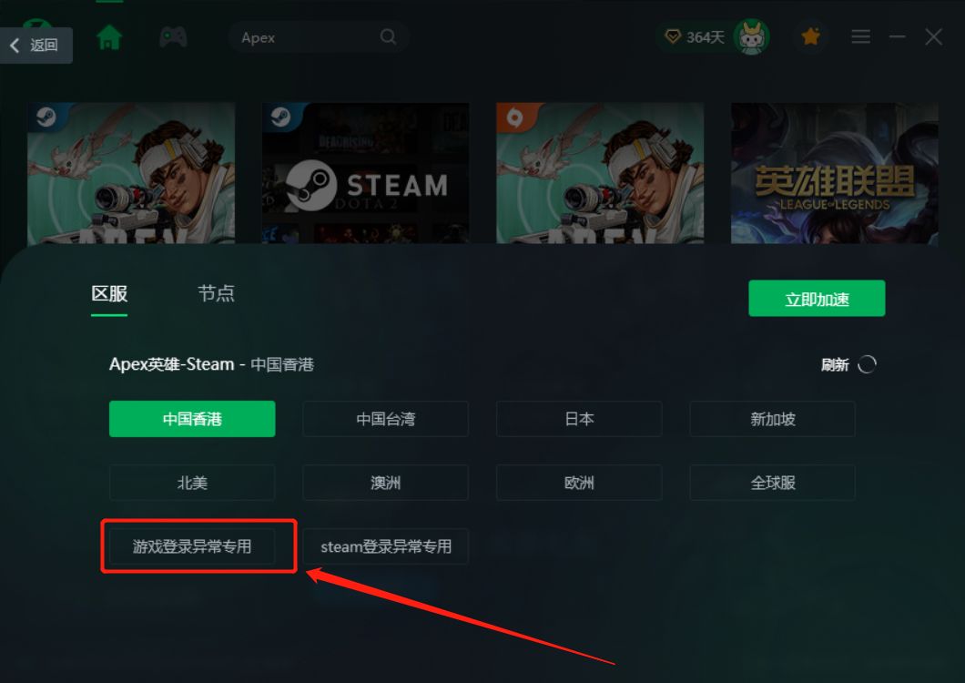 二、在迅游选择“游戏登录异常专用”区服进行加速: