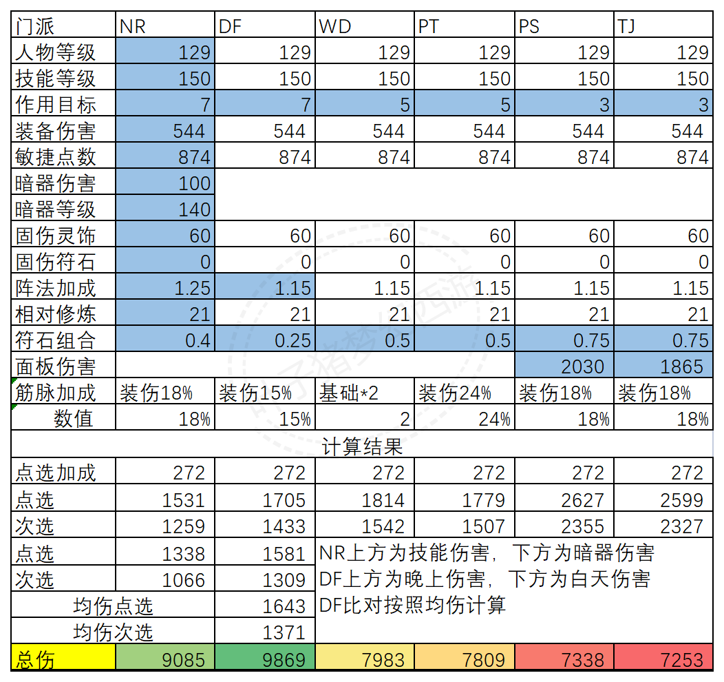 所以,如果你想玩一个高固伤的门派,那么129级及以上级别,在不考虑暴击的情况下选地府、女儿,考虑暴击则选择无底洞、普陀山。129级以下的固伤差别并不大,且没有暴击经脉加持,只考虑群秒个数、门派功能性选择即可。