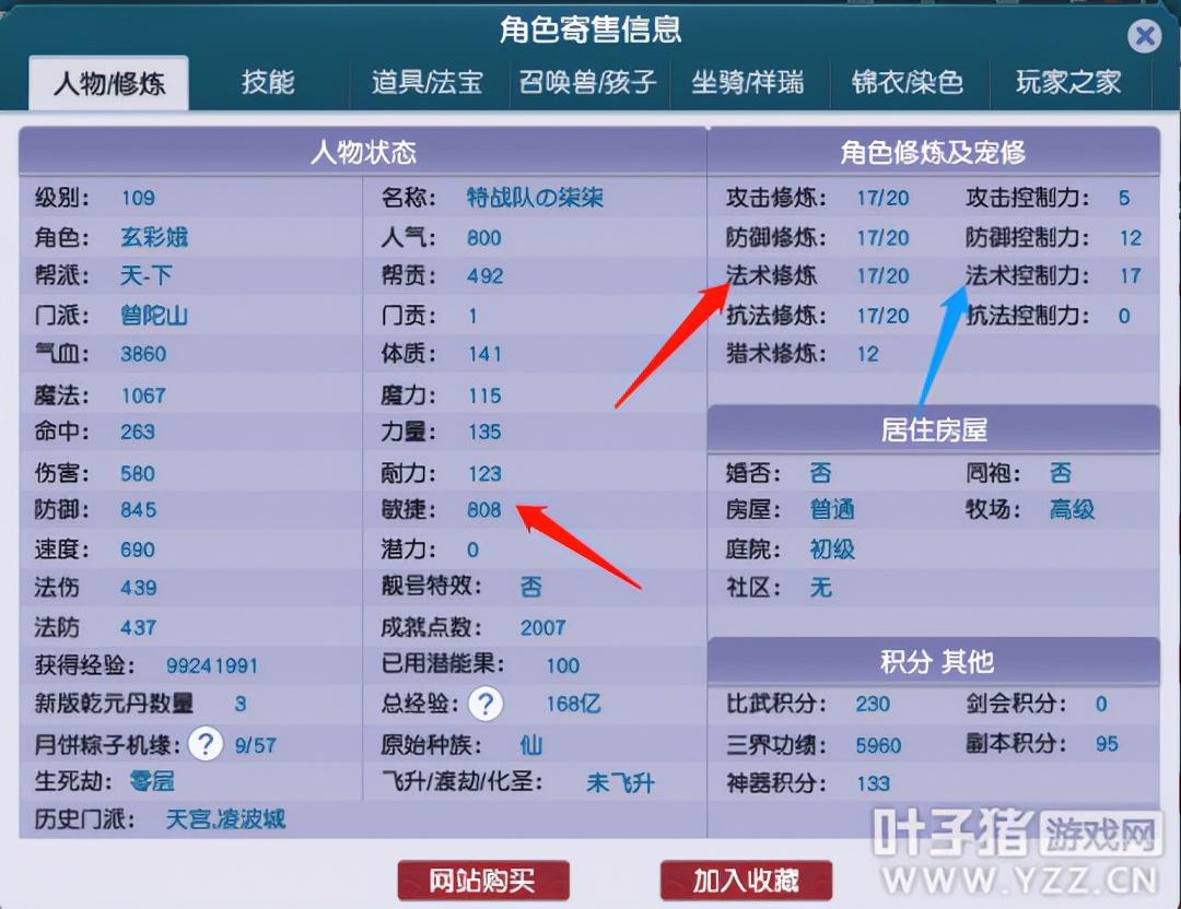 在挑选角色时,需要注意红色箭头的2个关键点,一是人物法修、二是人物加点,法术修炼和人物敏捷点直接决定着你的固定伤害,属于角色的先天条件。