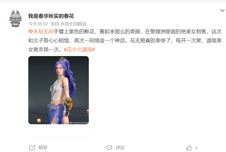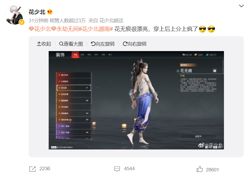 而这回《永劫无间》又单单只靠一个皮肤再度登上了微博热搜,昨日《永劫无间》X花少北联名皮肤【迦南·花无痕】正式发售,绝美的造型瞬间成为了全网玩家的热门话题,就连皮肤“本尊”花少北,都发博称联动皮肤确实太好看了,换上后自己上分都上疯了!