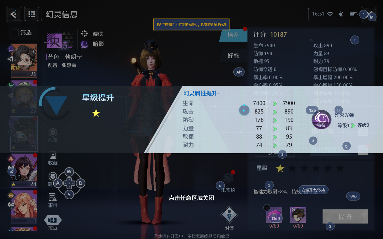 幻灵升星:需要消耗对应品质的通用碎片或者同角色的碎片来提升,最多6星,升星后会增加属性以及对应技能等级,同时星级也影响同步率提升上限。