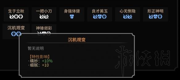 然后是特质加点,我推荐802加点,技艺点出一任自然和天工开物,武当需求道法,铸剑需求锻造。经历点发取决于你想玩什么流派,破体流点臂力根骨体质,破气流点灵敏悟性定力,这都是根据功法需求点的,然后点出谷中密友和芝玉,芝玉非常重要,能保证你的高机略,在战斗中能先手。而密友能让你你能轻松的产出优质的第二代,不需要导出找配种,另外推荐在生孩子前去玄女门把特性再提升一下。