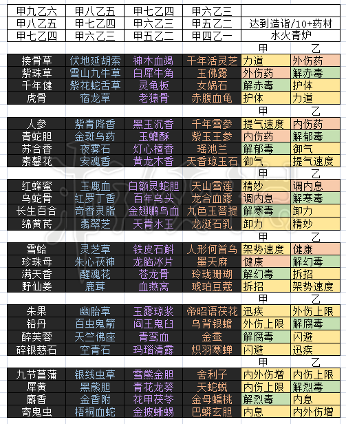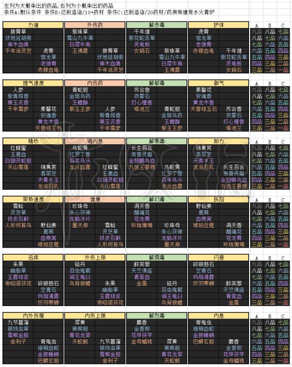 可以看出所有药里 六品/五品/四品 的药都有两种产出方法 事实上游戏中确实这三个品级的药各有两种,一般来说同品级下右列(就是小概率产出的药)的药效要比左列要好。