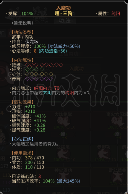 运功效果:装备在当前使用的内功格上就能提供人物属性。受发挥修习等影响。