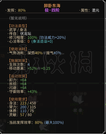发挥:123%,基于功法需求得到的数值,作用于伤害和运功效果。