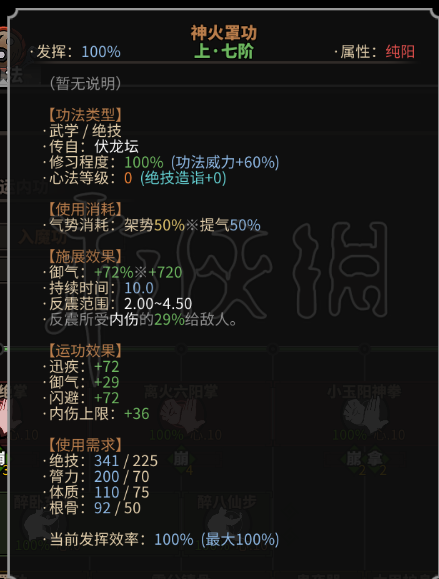 修习程度:100%,增加功法威力,低于25%的不可被装备。