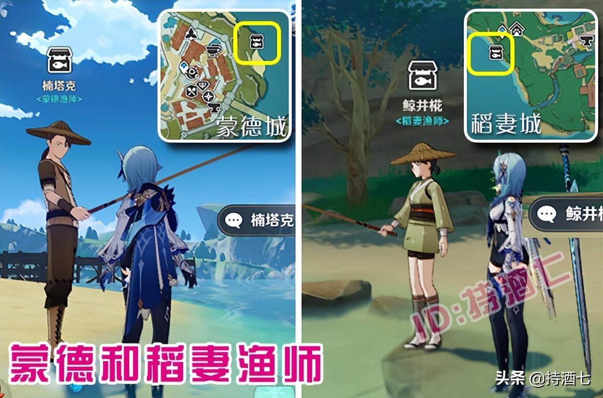 钓鱼系统中,有两个NPC渔师。一个在蒙德城外果酒湖畔,另一个在稻妻城郊的海边。