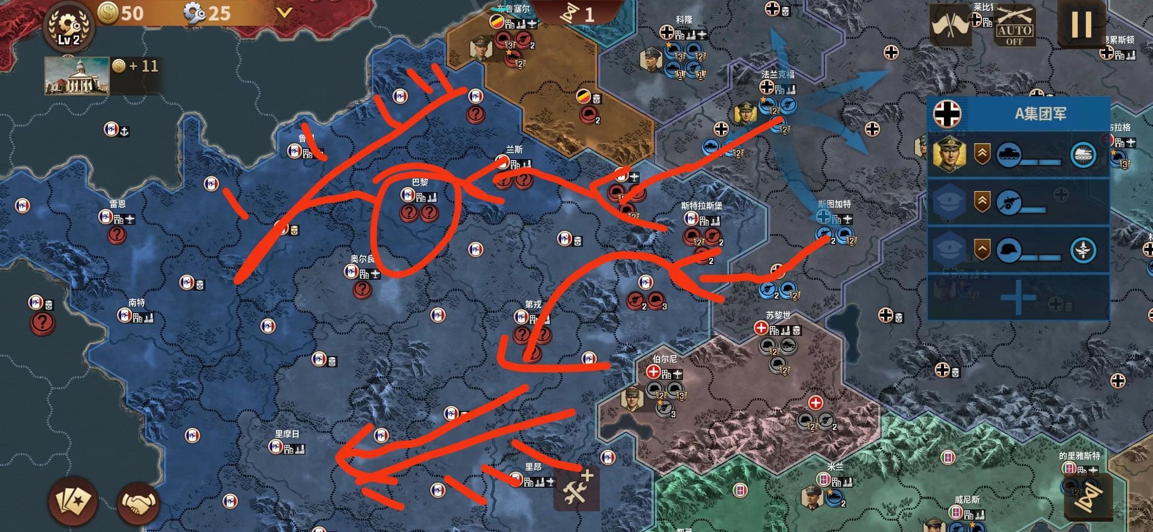 比如说德国进攻法国的一局。我采用的是历史上德国进攻的方法,先进攻斯特拉斯堡,拿下法国前线兵源,然后调动精锐的曼施坦因满编军团,快速突击兰斯。北部的友军牵制荷兰及比利时的军队。要点在南面,需要意大利的军团配合,以防南部退路被截断。(这是唯一要赌的部分,因为意大利不一定打的过。)进而攻克第戎,这会大大削弱法国中部的防御力量。北部在攻克兰斯后,迅速进攻巴黎,这是最困难的部分,拿下后延英吉利海峡拦截英国援军,随后清扫残余法国势力。南部则顺势拿下里摩日(这局里昂被意大利拿下,不然先应进攻里昂)这基本上就破局了,法国就差不多亡国了。