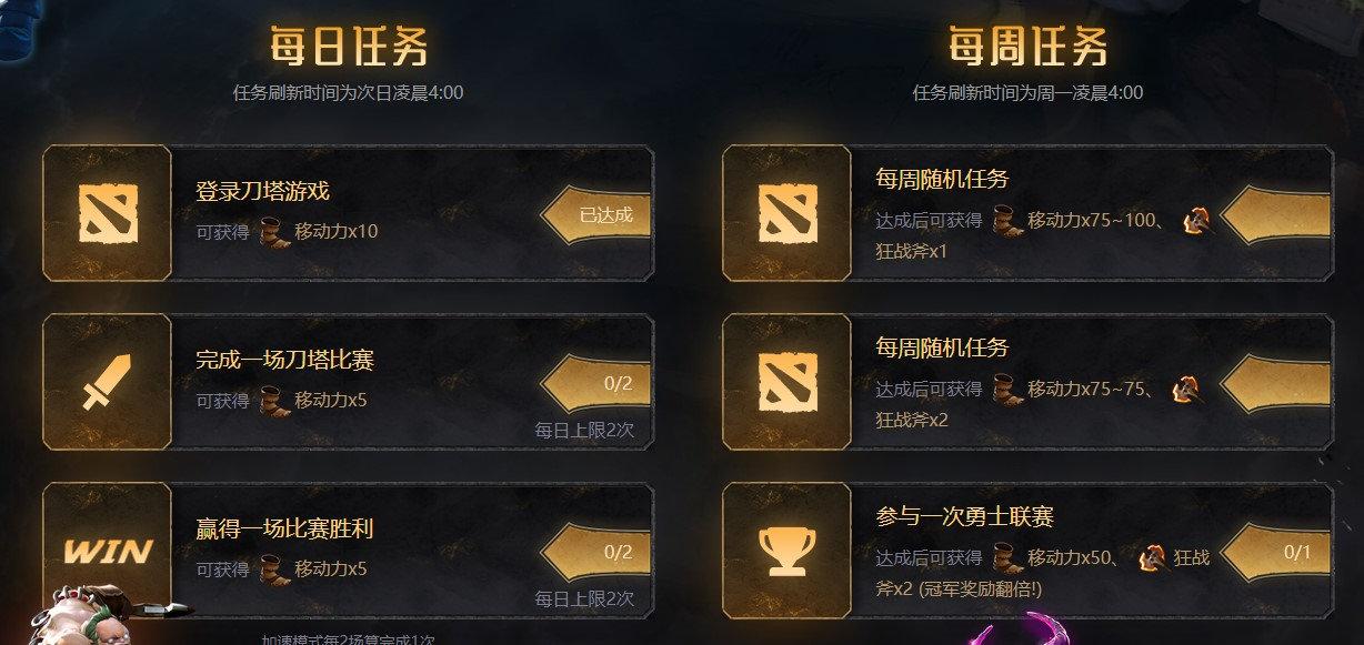 每天登陆DOTA2就可以获得10点移动力,并且全英雄选择、全英雄随机、随机征召、队长模式、队长征召、技能征召、单一征召、加速模式(每两场算完成1次)都算在完成任务的有效比赛类型之内,所以OMG玩家也不用担心完不成任务。