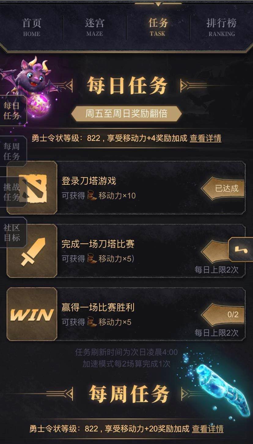 根据TI10勇士令状等级,完成每日任务、每周任务都将获得一定的加成。