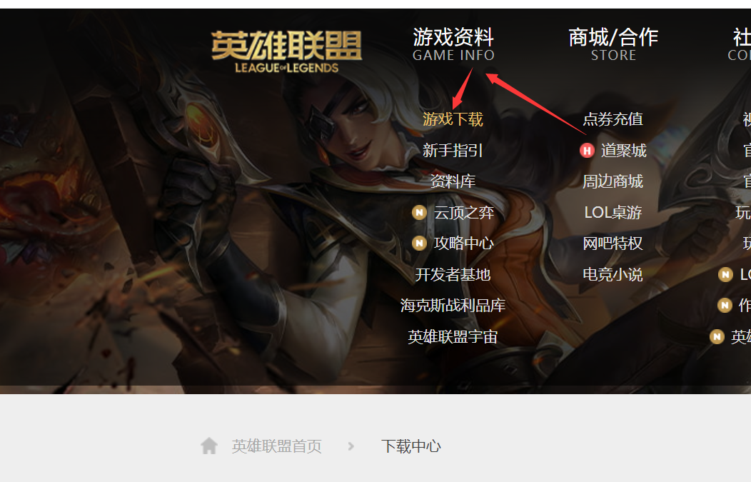 首先打开英雄联盟国服官网,在游戏资料的下拉菜单里找到“游戏下载”,点进去。