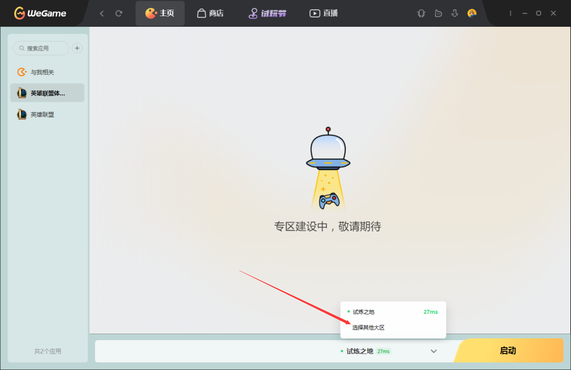 安装打开之后,区服点“选择其他大区”,然后选择“试炼之地”,然后更新一下就可以进游戏了。