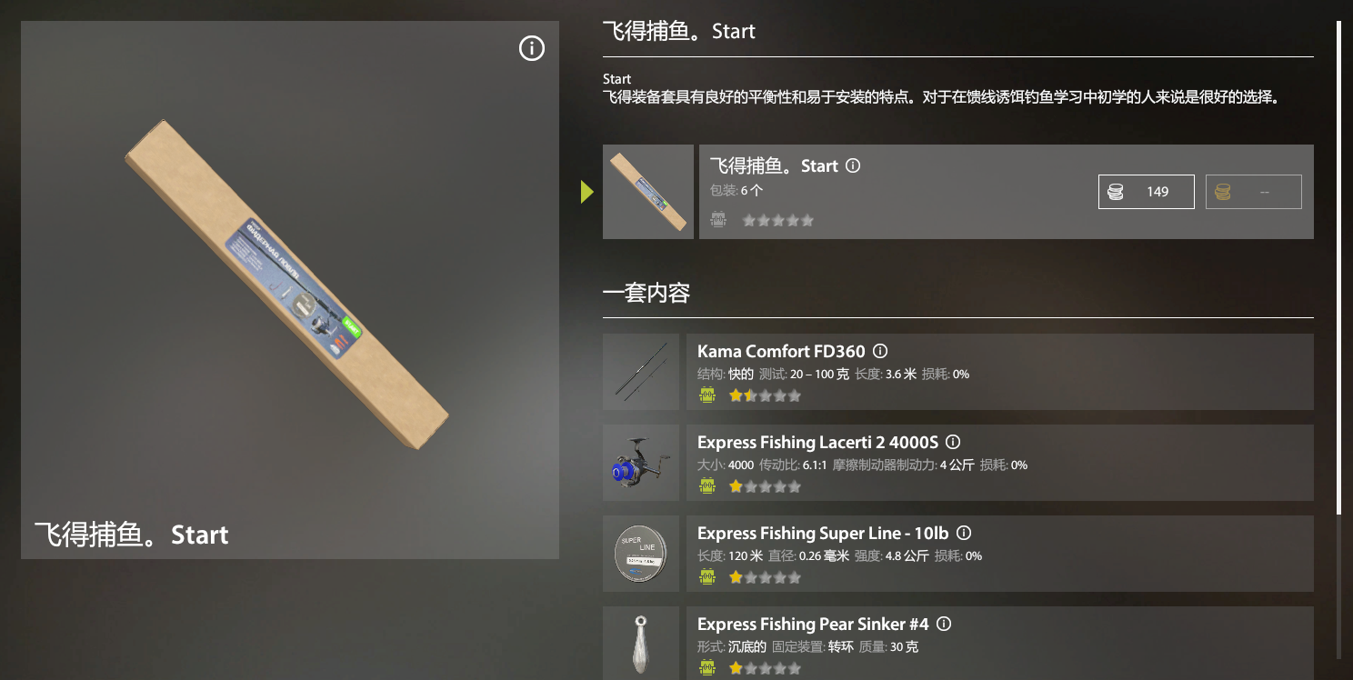 3.当积累到149枚的银币的时候,我们就去钓鱼店-鱼竿-套-飞德捕鱼start 价值149银币(这就是游戏内大家说的149)而新手前期的工作就是积攒450枚银币,购买3套149,记住!!是3套飞德捕鱼start!!其余的东西都不用买,有了3套149,就可以一边挂机一边做其他的事情,149中期有富足的钱可以换syberia牌子的Hydra G2 30s 5.5公斤拉力的鱼线轮,可以在12-22级之间拉大鱼不用那么费力,而且149可以伴随终身使用,后期钓一些小鱼都会用得到!