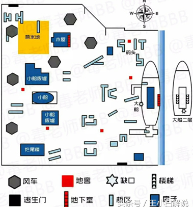 首先是湖景村,对于才出的湖景村整体来说他的地图的大小还是不算太大,这个地图里面有一个非常值得记住的点就是风车,一定要定位好风车的位置,因为逃生门在所有风车的左上角,还有一个地方就是大船一定要定位好,大船的入口的正下方就是逃生门!