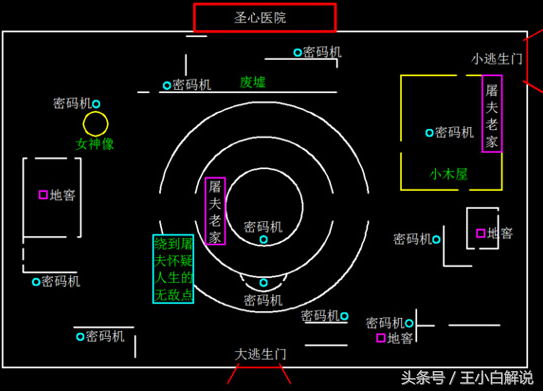 第三个地图就是圣心医院。这个医院的地图也是很容易被迷路,因为这个地图的中央的医院无论你从什么地方看过去都是一样的!所以这个时候你需要记住的就是关于小木屋的地方,因为小木屋的地方有地窖和逃生门,然后如果你记住了小木屋这样子你就可以大概的推算出另外一个逃生门在什么地方了!