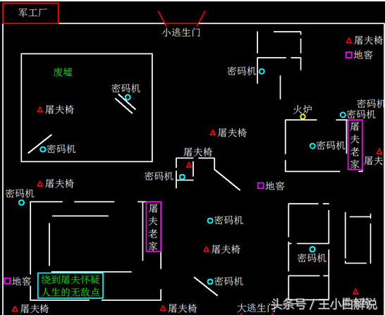 第二个地图是军工厂,军工厂这个地图是真正的正方形,大家一定要记住这个地图的逃生门是在两个方向而且要记住这个地图里面的地窖在什么位置,比如说你一定要记住小房子的位置在哪儿?这样就可以快速的定位你现在所在地方!