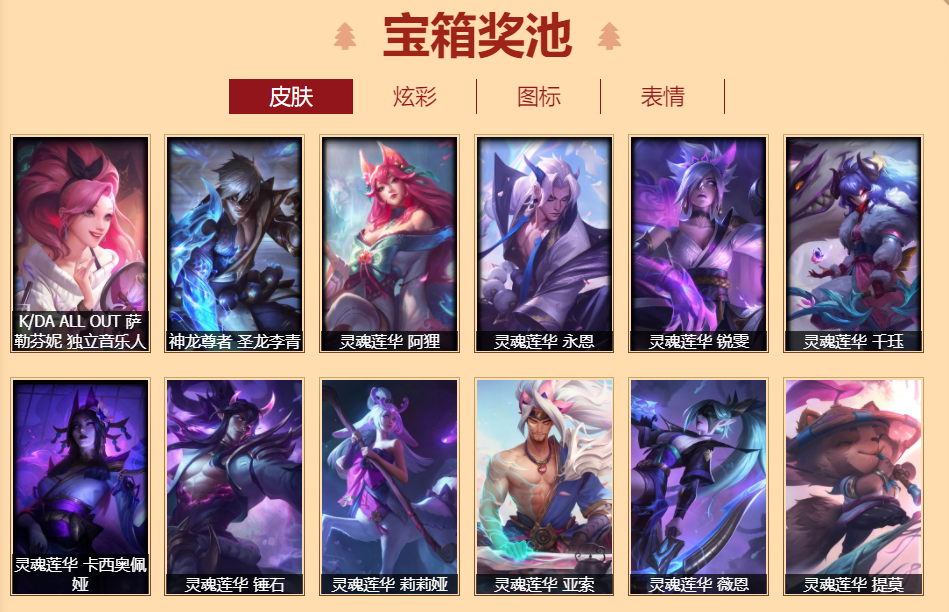 奖池包括皮肤、炫彩、图标和标签,皮肤奖池的都是永久皮肤,灵魂莲华、山海绘卷和K/DA等系列皮肤都在里面。不过运气非酋一点的可能开出来的就是炫彩、图标或表情。