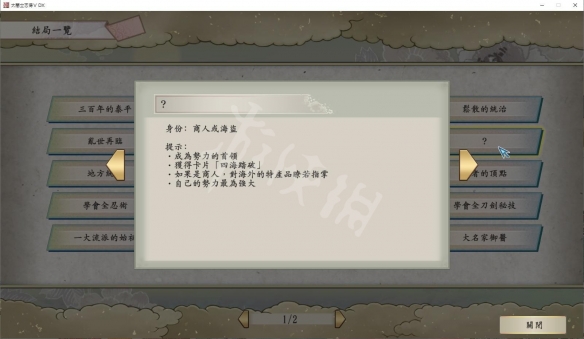 要等到自家大名(由计算机操控)武力征服全部大名or支配力3万6以上升至正一位进武士结局。
