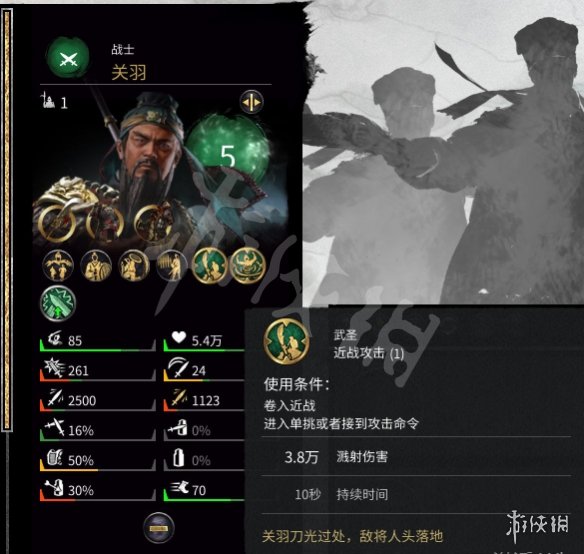 选择关羽最主要的原因是他的大招,【武圣】每场战斗只能用一次,主动释放3.8万溅射伤害 ,这点是非常恐怖的,因为往往5级火系将领生命值是2.5万,土系2.5万,水系是2万,金系4万,木系是5.4万,可见武圣威力之恐怖。所以,带上一个关羽之后,你的初期斩将的主动性大大提高,可操作性也大大提高。