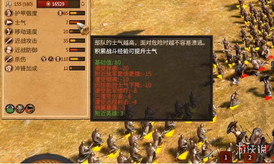 影响士气值的因素很多,包括侧袭,背袭,攻击造成的伤害,英雄技能等等。所以在战斗中如何尽快减少对方的士气就成为我们制定战术的一大重点。