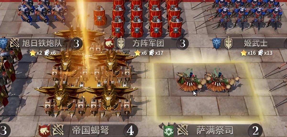 2:杠:将目标军团加入其同名金色军团之中(只继承基础数量)并获得一个4选1的军团宝箱,宝箱最多高于主城3级;3:半人马酋长:每入场3个具有战吼的军团,此军团获得+1数量并使两侧的奔马军团重新发动战吼效果(每回合限1次);