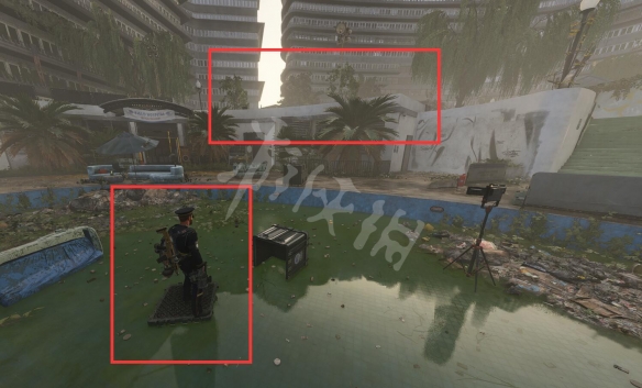 找到如下图所示的水潭后,在上面使用动作“开合跳”(默认动作使用键位是H键),2个猎人会同时出现在上方红色方块所示的屋顶上。