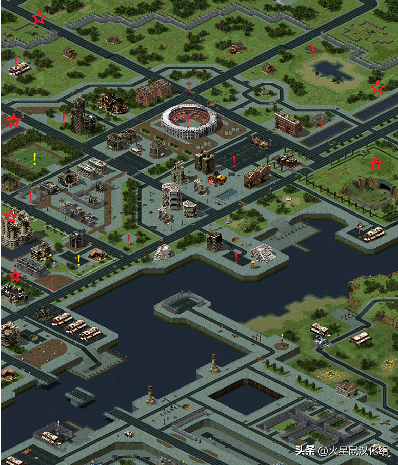 黄色的感叹号代表你可以获取的援军,其中加油站旁边的停车场你可以获得一辆镭射小车,而足球场中你可以救出被困的特工罗伯特。