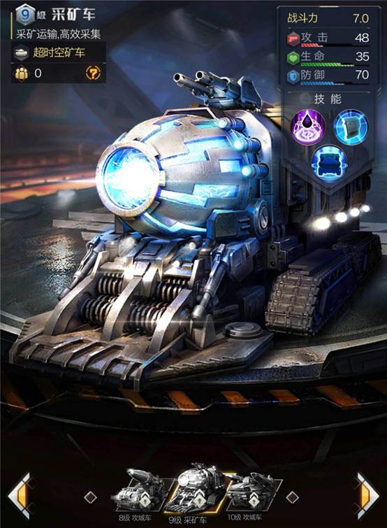 从图中我们可以看到,采矿车等级从低到高,属性有所提升的同时在技能方面也有所增强,我们现在简单介绍一下它的的三个技能。