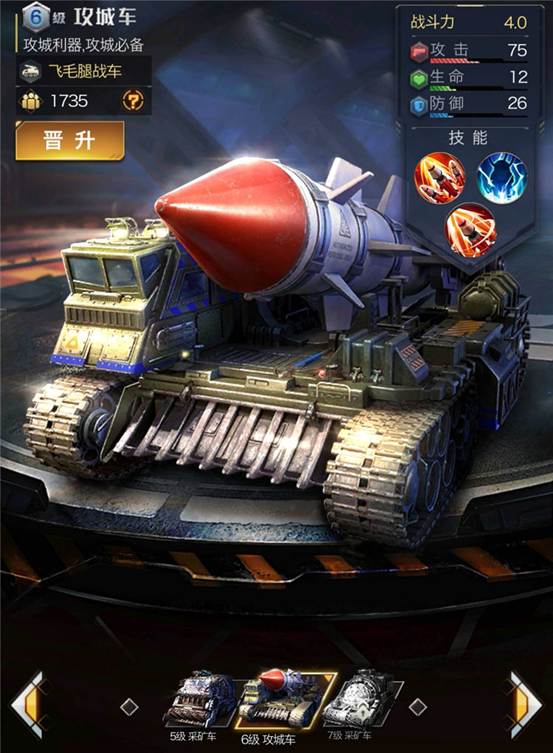 以上就是对攻城车的一些技巧分析。攻城车是一种高输出的兵种,同时也是后排兵种中最高血防的兵种,但它并不像主战坦克和突击步兵这些英雄一样,拥有暴击和破甲之类的属性。指挥官们在出征的时候需要安排足够的扛伤害兵种,例如防御坦克,采矿车等等。