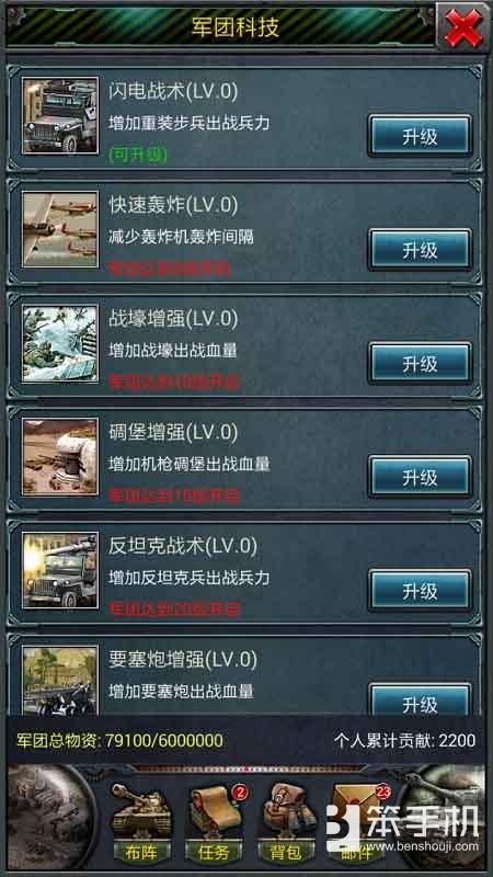 加入一个军团可以得到额外的属性加成,军团等级越高,解锁的加成可以也就越高。当你的军团达到5级的时候,就可以解锁“闪电战术”(增加重装步兵出战兵力)和“快速轰炸”(减少轰炸机轰炸间距),等军团达到10级后,开放第三个军团科技战壕增强(增加战壕出战血量)。