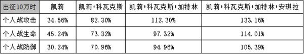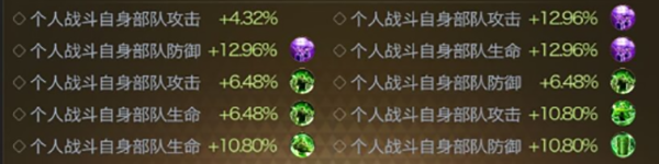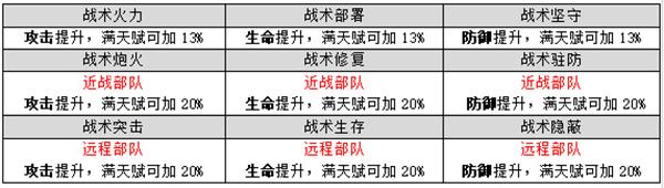 除了芯片和任命,凯莉天赋的选择也同样重要。凯莉的自身天赋为“武装补给”,个人战增加部队生命15%。推荐天赋有九种之多,分别为全兵种、近战部队、远程部队的攻击、生命、防御。具体属性如下: