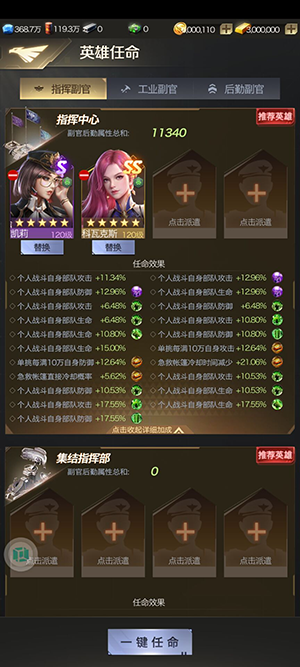 指挥中心最多有四个任命位置,专属英雄科瓦克斯和凯莉是必选,其他后勤英雄的选择,在上一期小雅为大家介绍科瓦克斯的时候,有过详细的对比,详情请戳。总的来说,如果是个人战比较多的指挥官,剩余两个位置的任命建议优先选择加特林、安琪拉;如果参加集结战斗较多,加特林和安琪拉这种后勤属性较高的英雄,就要优先被任命在集结指挥部了。
