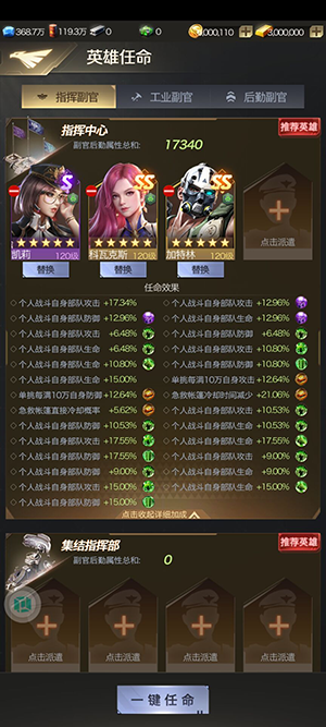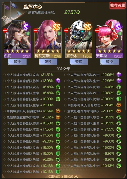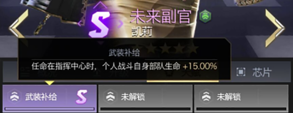 说完芯片选择,我们再来看看凯莉和其他后勤英雄任命在指挥中心后的属性加成。