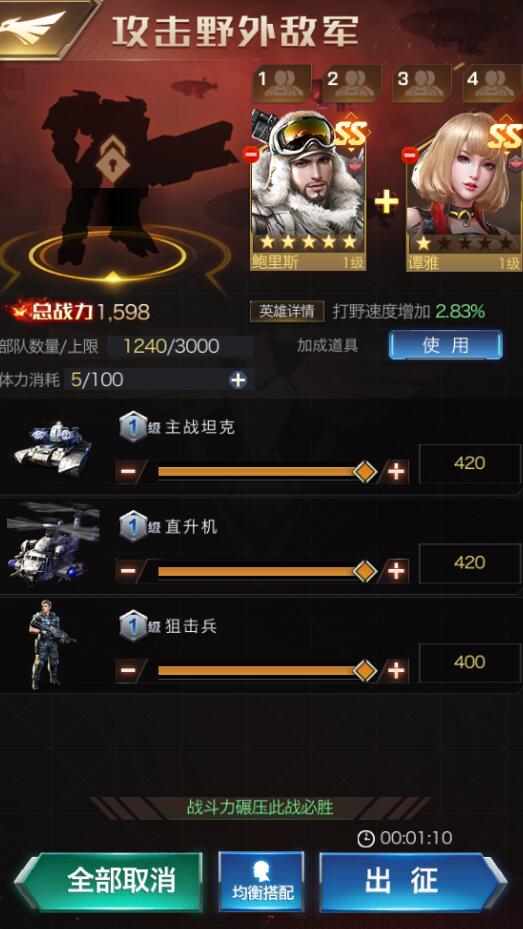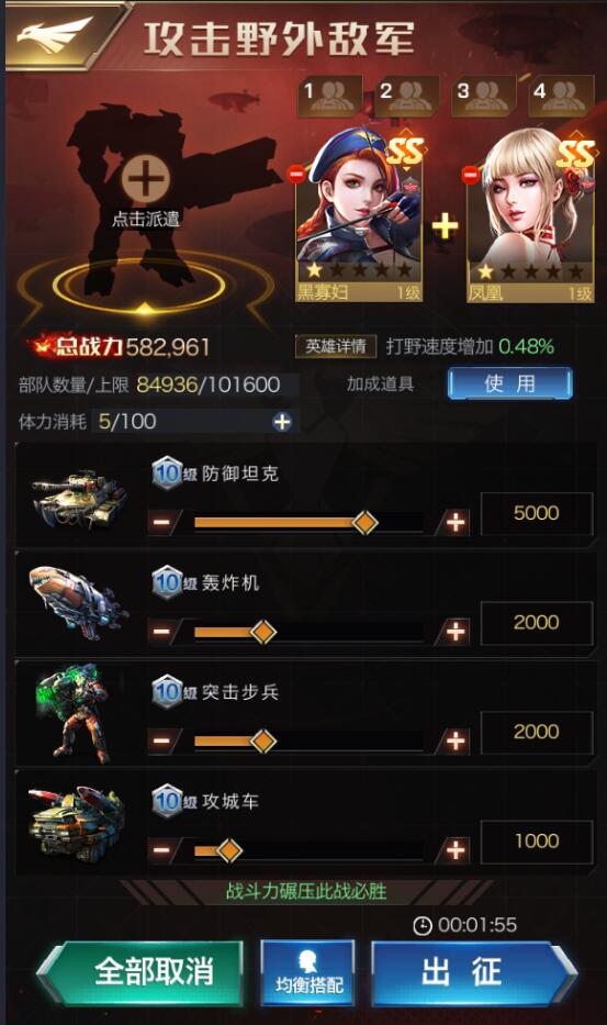 当指挥官们选择好要进攻的目标后,就可以开始安排部队兵力配比,通过调整各个兵种以及兵种的数量,就可以获得最高等级、最大负重、最快行军或者是均衡搭配等不同效果。根据不同情况下的部队搭配,我们可以在游戏初期级别较低时,搭配50%的防御坦克、20%轰炸机和30%步兵,这样的组合好处就是生存能力强,负重比较高。在游戏中后期,随着等级逐渐升高,可以搭配50%的防御坦克、10%主战坦克、15%轰炸机、15%步兵和10%的攻城车,也可以让整个队伍生存能力更强,输出依旧很高。当然我们也可以在空军中只搭配轰炸机,而在坦克部队中以防御坦克为主,搭配一定比重的主战坦克和突击步兵,防守时用狙击兵代替突击步兵即可。