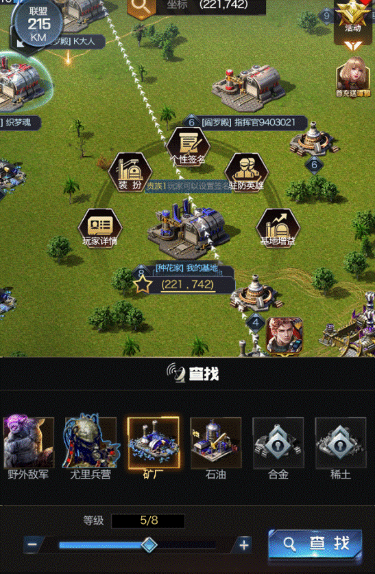 进行野外探索采集,操作是很简单的,在基地外界面点击右下角的搜索按钮,就可以进入图片当中的选择界面,查找基地附近的资源点,然后根据自己的需要进行采集矿石、石油、合金和稀土等战略物资。
