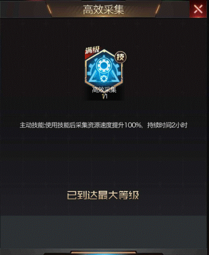 战略当中,还有主动技能【高效采集】,可以在使用后把采集资源的速度提升100%,技能持续时间两个小时。