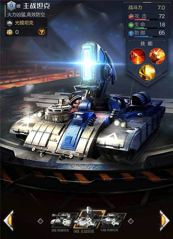 3级主战坦克:磁暴坦克,和磁能坦克一样,作为低等级的主战坦克,三种属性都比较均衡,在防御方面略高,有两个技能,对敌方部队中的空军起一定的克制作用。