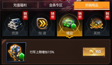 3.点开基地的基地增益一栏,有提升行军上限的道具,分别有提升15%和提升25%两种,还可以从商店的热销商品中购买。开启扩编道具可以在外出采集时派遣更多兵力,以免负重不够。如果指挥官长时间不能上线,可以考虑开启时空屏障的情况下,同时开启扩编道具增加部队出征量,长时间采集联盟矿。