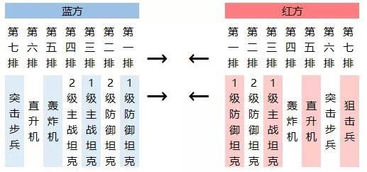 在讲解战斗机制前,这里先放一张双方战斗的站位图。从站位图上可以看到,指挥官在战斗的时候,从第四排开始后面全是远程部队。当然这只是站位图的分布,实战需要我们自己来理解。例如,要出一队轰炸机极限流的兵种,英雄和机甲等等的先不考虑,在兵种上,防御坦克是一定要的,如果没有防御坦克,轰炸机成了第一排的兵种,很快就会败下阵来。敌人的攻击是优先打到防御坦克上的,除非轰炸机和直升机特有的技能,可以隔很多回合跳过防坦攻击一次后排外,其他兵种的攻击不会越过防坦直击后排。