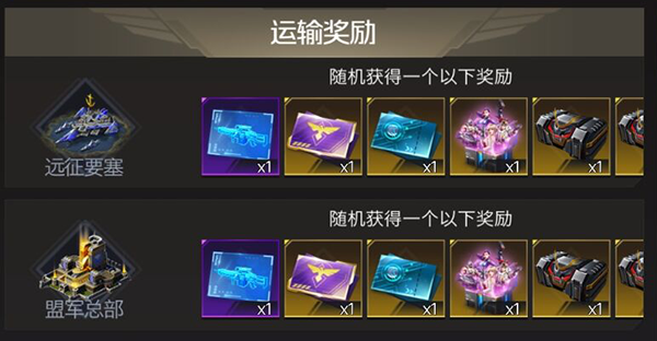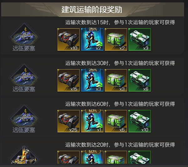 建筑运输阶段奖励:远征要塞的运输次数分别达到15次、30次、60次或盟军总部的运输次数达到20次、50次、100次时,参与1次运输的玩家即可领取建筑运输阶段奖励。
