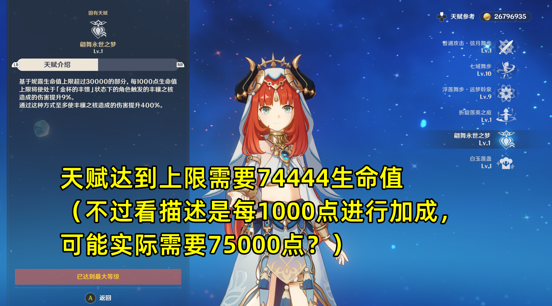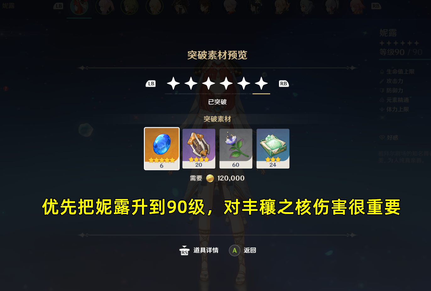 另一个是根据妮露生命上限超过3W的部分给丰穰之核额外提供伤害,最多加400%(需要生命上限达到74444),该天赋和精通加成属于同一乘区即为加算关系。所以把妮露优先升到90级还有一个好处在于生命白值提高,能放大圣遗物和武器等生命加成的收益,从而让天赋收益更高。以上两个天赋,决定了妮露配队和圣遗物武器出装的思路,就是尽可能堆生命和精通(优先生命,全队受益的丰穰之核和妮露自伤都能提升,堆精通实战不一定由妮露触发绽放),来提升丰穰之核的伤害。