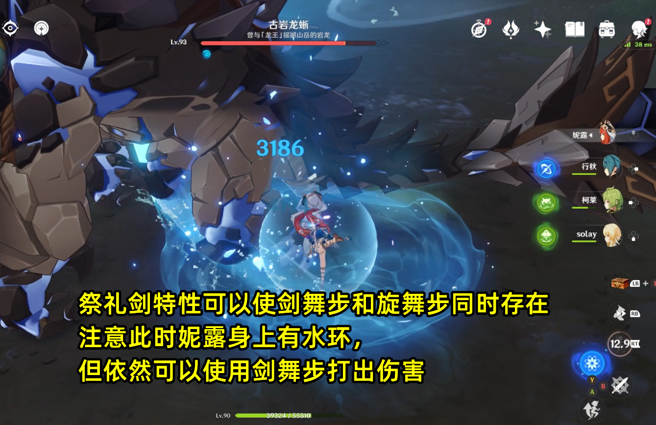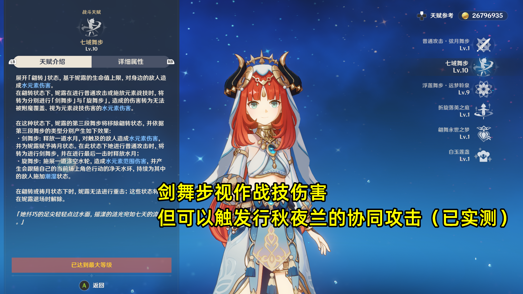 元素战技七域舞步,分两种攻击模式,由第三段舞步按下的按键决定:普攻键是剑舞步,此时妮露可继续在场上使用剑舞步攻击;E键是旋舞步,生成一个随身可脱手的水环,要注意的是水环只有生成那一下有伤害,后续只提供挂水功能。另外要注意的是,剑舞步虽然是战技伤害,但动作由普攻键触发,逻辑和雷神大招一致,所以可以触发行秋和夜兰的协同攻击。