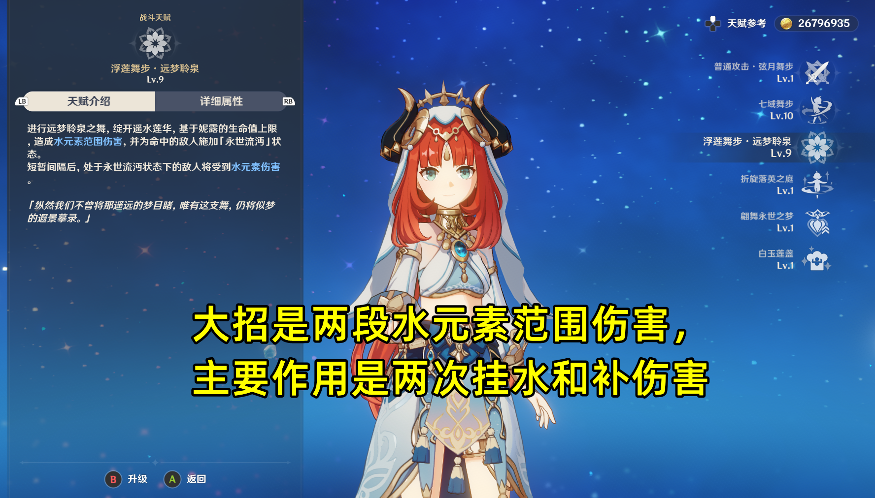 元素爆发浮莲舞步· 远梦聆泉,机制简单明了,就是两段范围水伤,被第一段命中的敌人短暂间隔后受到第二段伤害。主要作用是增加两次挂水和补充伤害,对于绽放流妮露来说大招并不是特别重要,不过高命加持下的妮露大招则可以看作一个“小核弹”。开头提到,绽放流妮露可以不着急升级天赋,但素材充足的情况下还是建议升一下给妮露自身加点伤害:普攻可以不用点,元素战技优先级大于元素爆发。