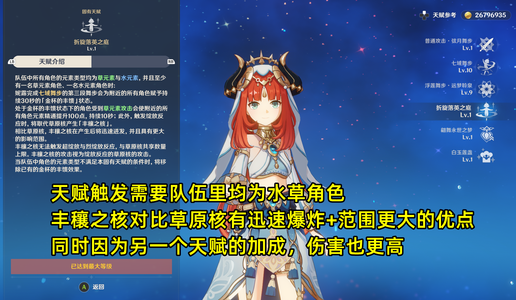 妮露的核心机制在于她的两个固有天赋。一个是限定水草队的前提下,妮露完成第三段舞步后给全队赋予“金杯的丰穰”buff,拥有该buff的角色受到草元素攻击(包括种子)会给全队加100精通,另外原绽放种子会变成迅速爆炸、范围更大的“丰穰之核”。丰穰之核本质上还是绽放生成的种子,故伤害依然受到精通和角色等级的影响。
