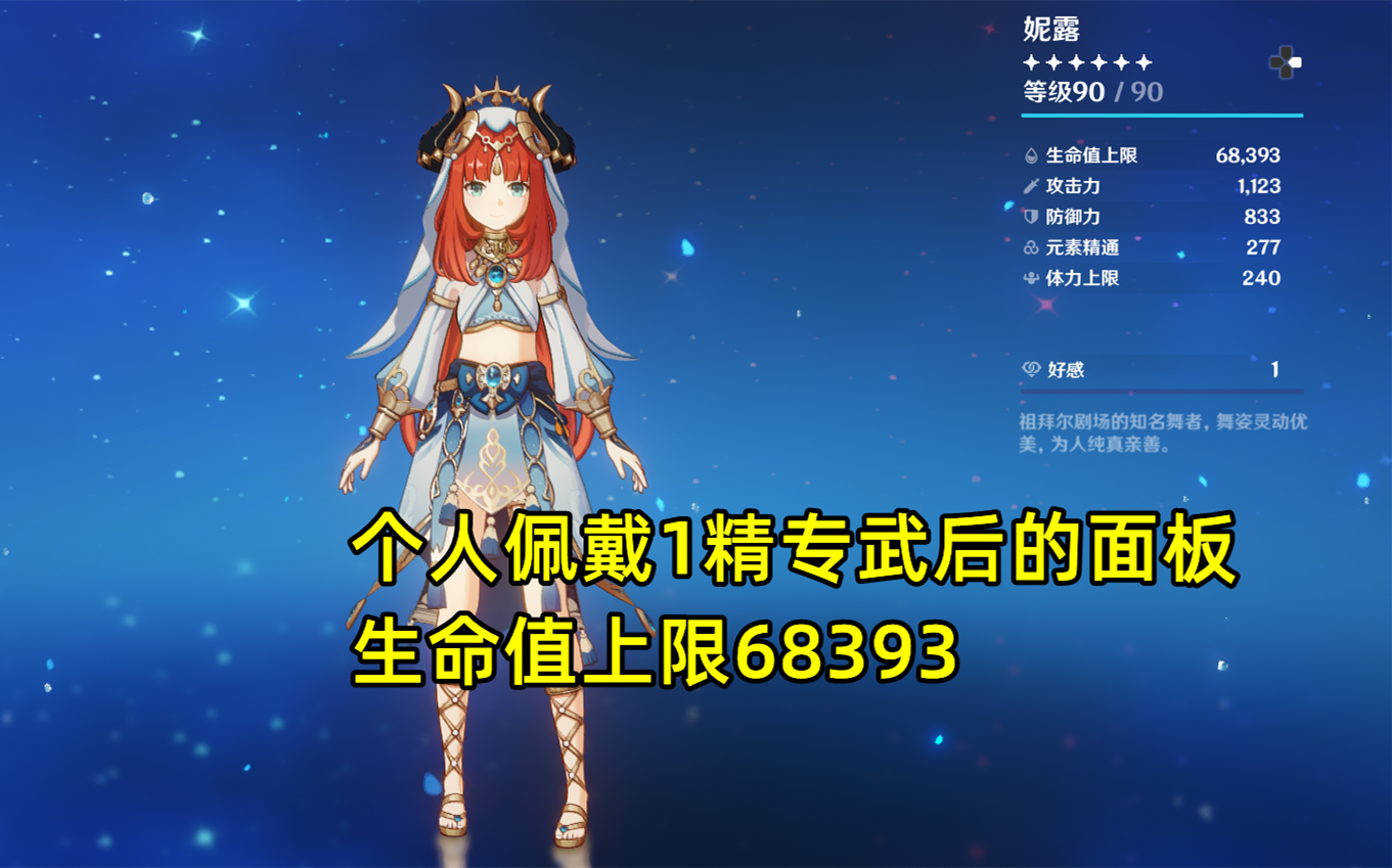 现有圣遗物里没有特别适合妮露的套装,故选择2+2散件搭配。首推2千岩+2乐团/饰金(不推荐2水),主词条生生生,副词条大生命>精通>小生命>双暴,花和羽毛尽量找大生命,沙杯头找精通(或小生命)。以个人面板为例,在携带1精专武的情况下且按照上述倾向配圣遗物的情况下,生命上限为68393,和天赋加成上限所需的74444仍有一段距离。非专武的话更不可能出现溢出的情况,放心堆生命即可。